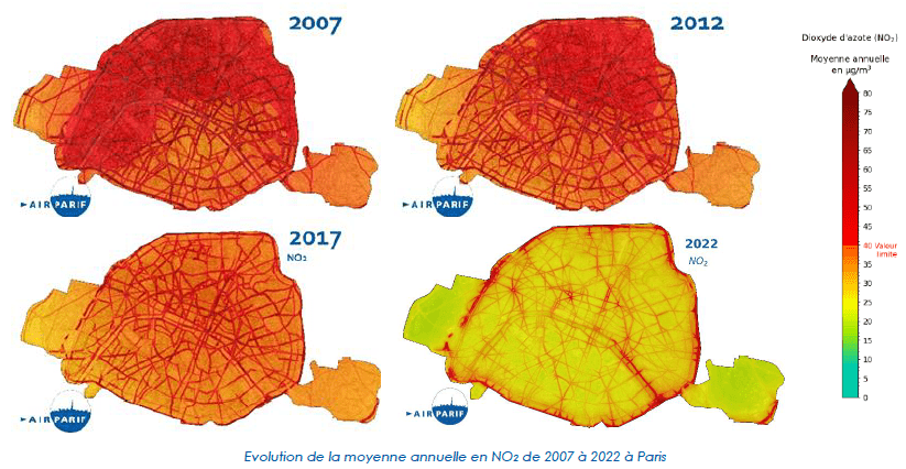 En France, la valeur limite de concentration annuelle de NO2 est actuellement de 40 µg/m3. Cette valeur sera réduite à 20 µg/m3 en 2030 afin de respecter la nouvelle directive européenne sur la qualité de l’air et se rapprocher de la valeur guide de 10 µg/m³ de l’Organisation mondiale de la santé (OMS, 2021). Ces nouveaux seuils de référence sont plus exigeants afin de mieux protéger la santé des populations vis-à-vis de la pollution de l’air ambiant.