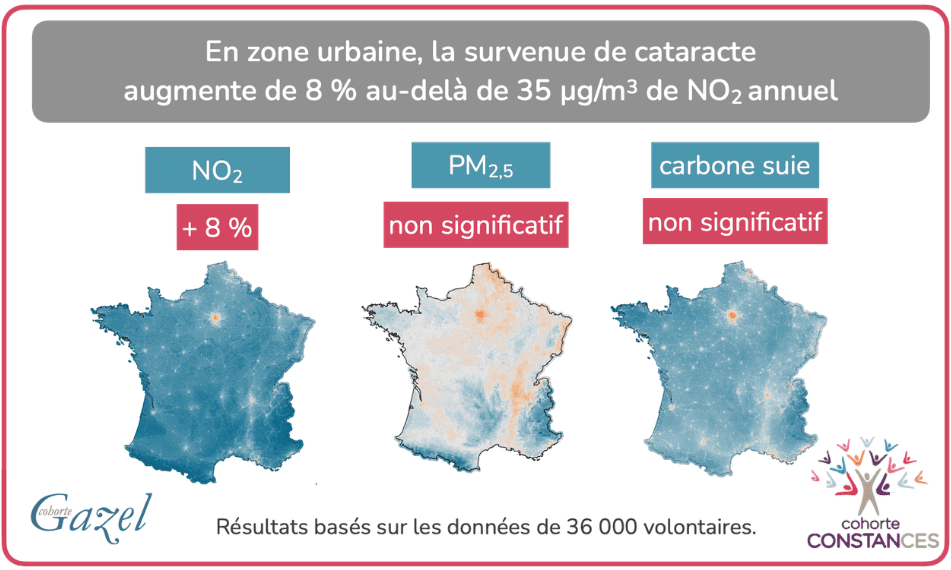 Pour la cataracte, les chercheurs ont identifié un effet de l’exposition au NO2 pour les participants vivant en zone urbaine au moment de leur inclusion. La survenue de cataracte était augmentée de 8 % au-delà d’une concentration annuelle de 35 µg/m3, après prise en compte les facteurs de confusion (sexe, âge et niveau d’éducation). Aucune association significative n’était retrouvée pour les participants vivant en zone rurale.